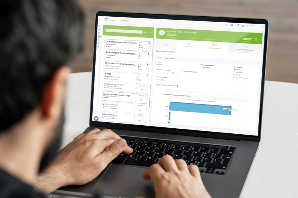 Die für uns wichtigste Funktion von simplyOrg ist die komplette Planung aller Seminare und Online Trainings. Hier fließen alle wichtigen Daten und Informationen zusammen und können intelligent verknüpft werden. Gleichzeitig wird das Kundenportal automatisch aktualisiert.